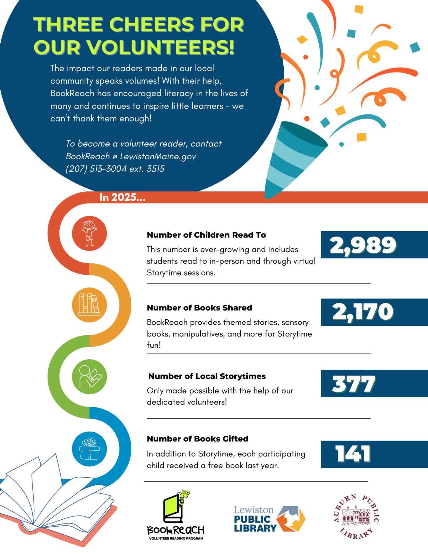 In 2025, BookReach, a free literacy program funded by the Lewiston and Auburn Public Libraries, made a huge impact! Three cheers to our dedicated volunteers!!! 🎊