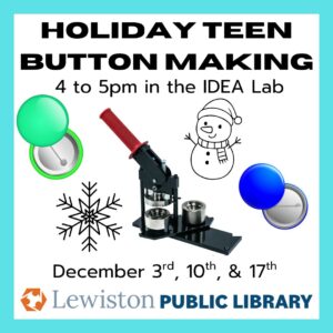 Teens, on December 3rd, 10th, and 17th come to the 2nd floor IDEA Lab at the Lewiston Public Library for our free button making program! Our self-serve button making station is available for all teens...