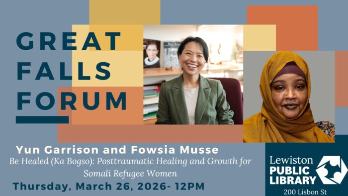 The 2025-2026 season of the Great Falls Forum continues Thursday, March 26th, featuring Yun Garrison and Fowsia Musse with a talk entitled “Be Healed (Ka Bogso): Posttraumatic Healing and Growth for Somali Refugee Women.” This free, public program will take place from 12 noon to 1 PM in Callahan Hall at the Lewiston Public Library.