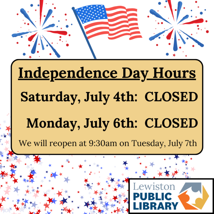 The Library will be CLOSED on Saturday, July 4th and Monday, July 6th in observance of Independence Day. We will reopen at 9:30am on Tuesday, July 7th.